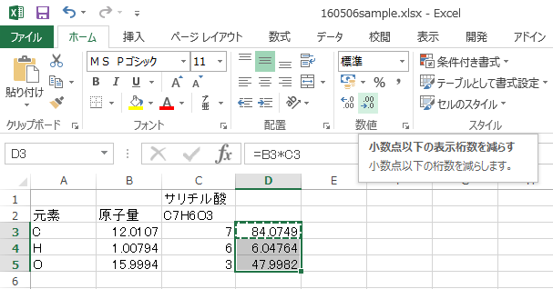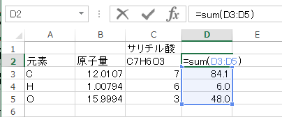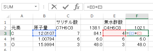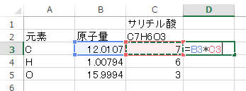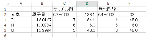 サリチル酸と無水酢酸はともに炭素、水素、酸素からなる。それぞれの元素の原子量を調べて、ExcelのA3からB5までのセルに入力する。