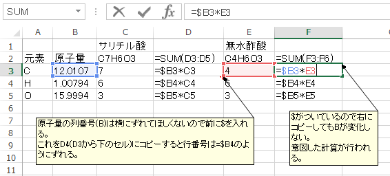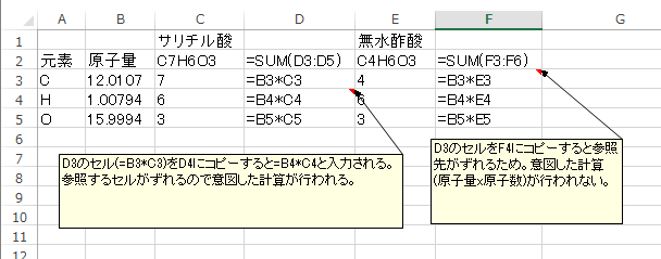 式がセルを参照している場合、式のコピーに合わせて参照先が自動的にずれるようになっている。 これを相対参照と呼ぶ。 一方自動的にずれてほしくない場合もある。 上の例ではD3の数式のうち、原子量を参照しているところは横にずれてほしくない。 その場合は絶対参照を用いるとよい。