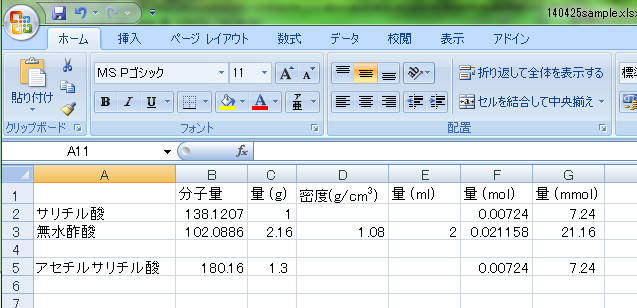 A2のセルに「サリチル酸」と入力する。B2のセルを選択し=を入力したあと、「分子量」ワークシートのサリチル酸の分子量のセルをクリックする。これによりB2のセルには別のワークシートの値が表示されるようになる。別の方法としてはコピーしたあと、形式を選択して貼り付けで「リンク貼り付け」を使う。