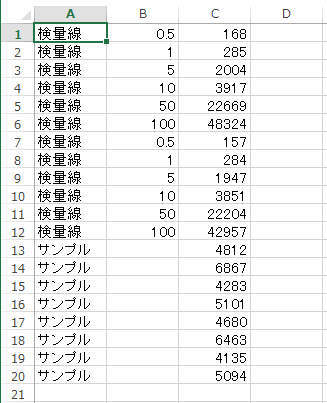 今回の検量線は0.5から100までと幅広くとっており、その間は等比になっている。 このような場合に直線回帰を行うと値の大きなものにふられてしまう。 そこで、等比データを等差データに変換するために対数をとってから計算を行う必要がある。