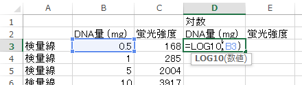 まず表の見出しをつける。 続いてDNA量、蛍光強度の対数をLOG10関数で計算する。