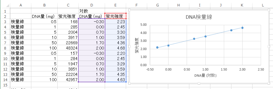 検量線が対数で計算されているので、サンプルの蛍光量も対数に変換する。