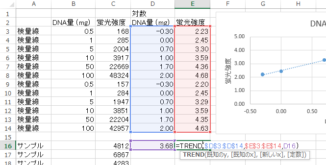 TREND関数を使ってDNA量を計算する。