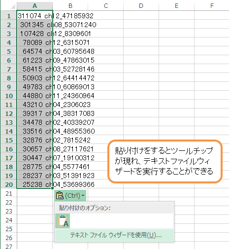 まず上記のデータ(20行)を選択し、Ctrl + cキーを押してクリップボードにコピーする。 そのままExcelに貼り付けると左の数値部分と右のマーカー名が同じセルにはいって集計することができない。