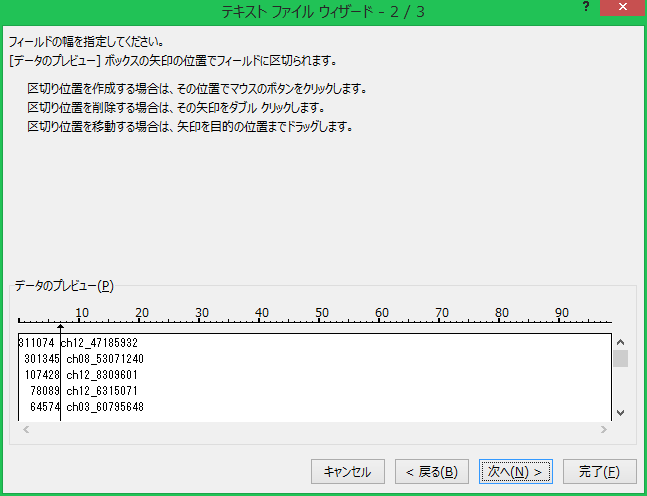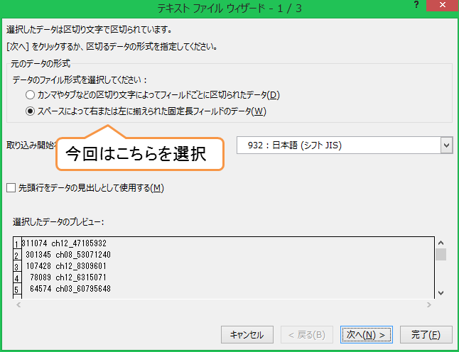 今回のデータは位置が空白でそろえてあるデータなので、「スペースによって右または左に揃えられた固定長フィールドのデータ」を選択して、「次へ」をクリックする。