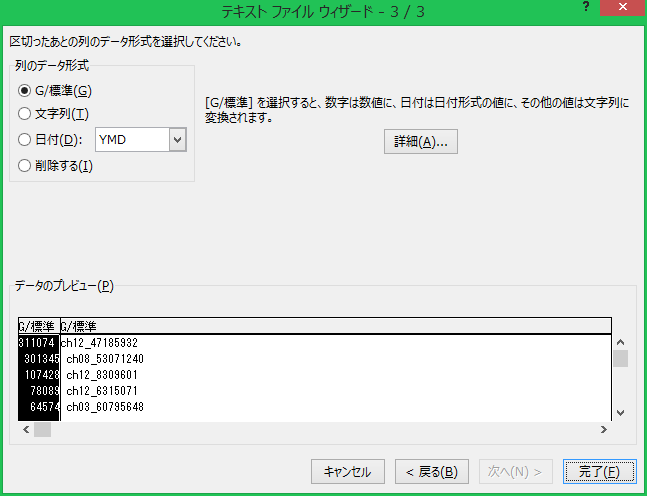 データ型の変更が必要ならば行う。今回は必要ないのでそのまま「完了」をクリックしてウィザードを終了する。