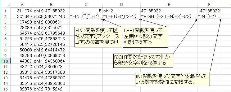 上記のように見た目が整えられたデータを関数を使って計算や集計に適したデータに変換することもできる。 マーカー名のch12の部分と_(アンダーバー)以降の数字を以下のようにして分割する。