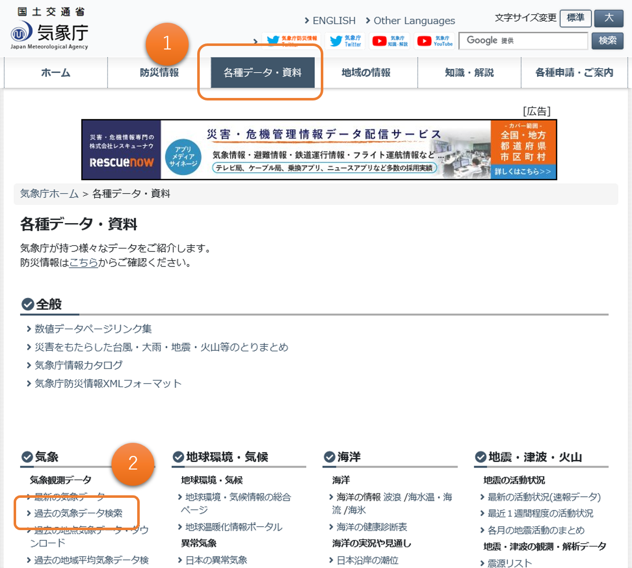 気象庁のウェブサイトから「各種データ・資料」-「過去の気象データ検索」とたどって検索ページを開く。 または http://www.jma.go.jp/jma/menu/menureport.htmlを開く。