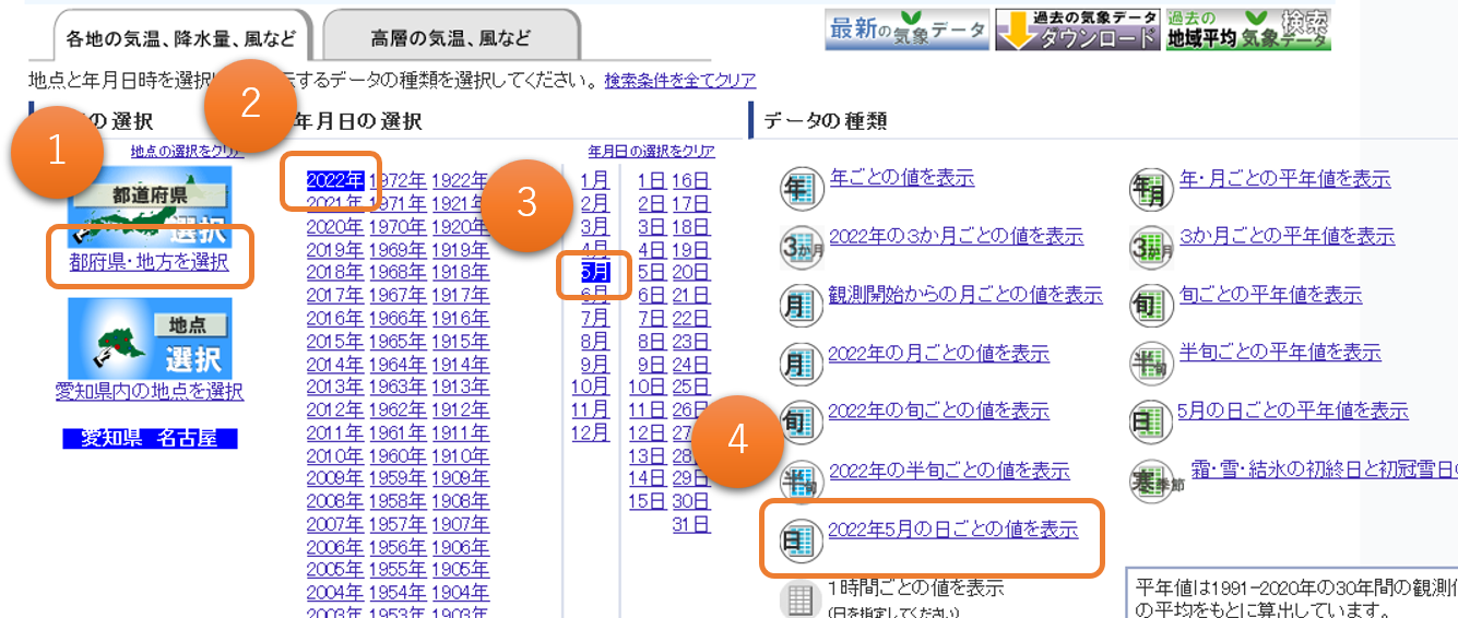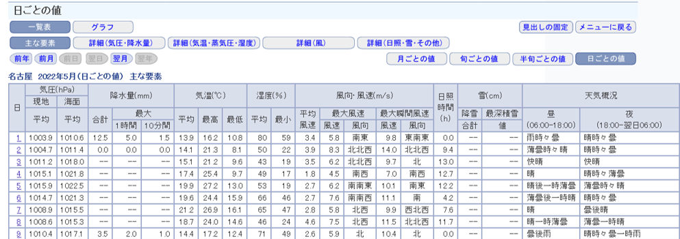 「都道府県・地方を選択」をクリックして愛知県名古屋市を選択する。 2022年と5月をクリックしてから「2022年5月の日ごとの値を表示」をクリックする。