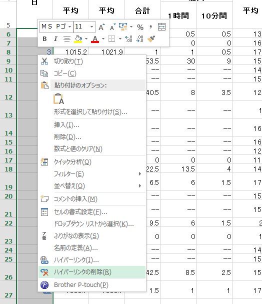 リンクが設定されているセルを選択し、右クリックで現れるメニューから「ハイパーリンクの削除」を実行する。
