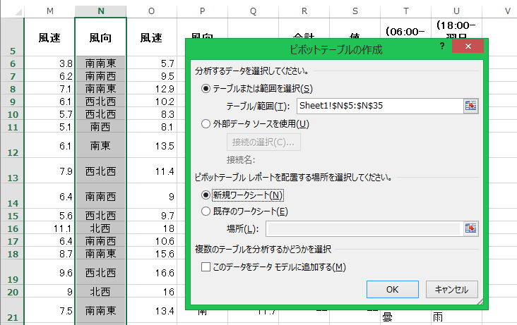最大風速の風向を選択し、ピボットテーブルを使って風向ごとの回数を集計する。 今回は新規ワークシートにピボットテーブルを作成する。