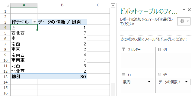 行ラベルに風向を設定し、データの個数を表示する。