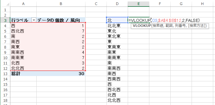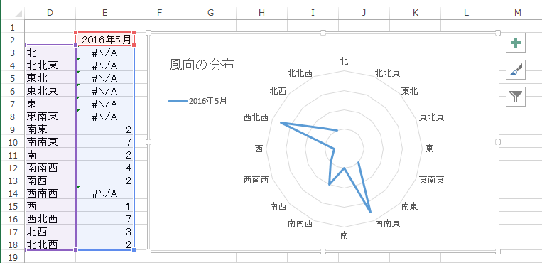 ピボットテーブルは文字コード順に並べるので一般的な北からの順に並ばない。 このままでは図にしにくいので、16方位のデータを作成する。
