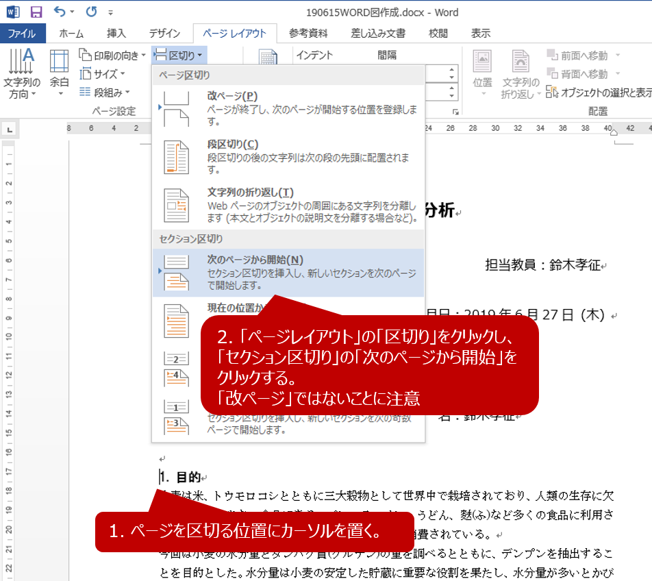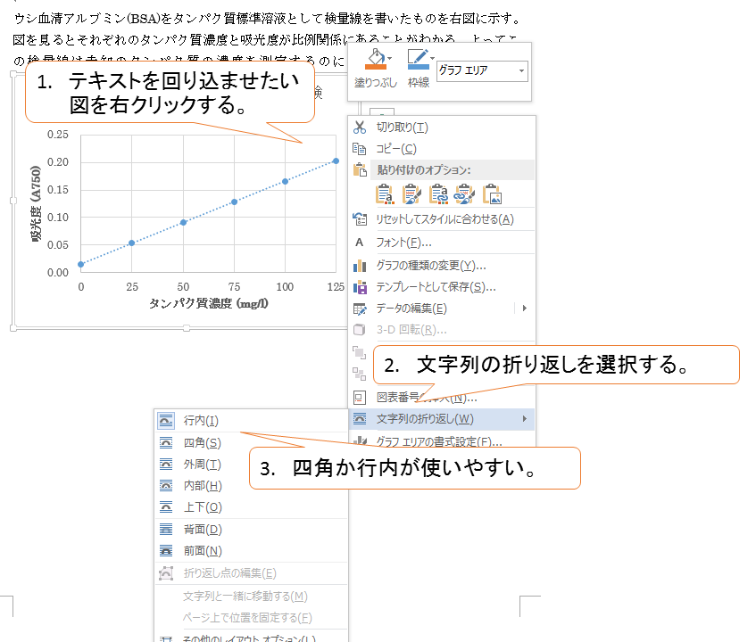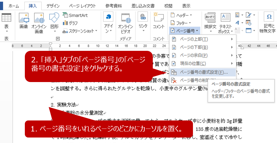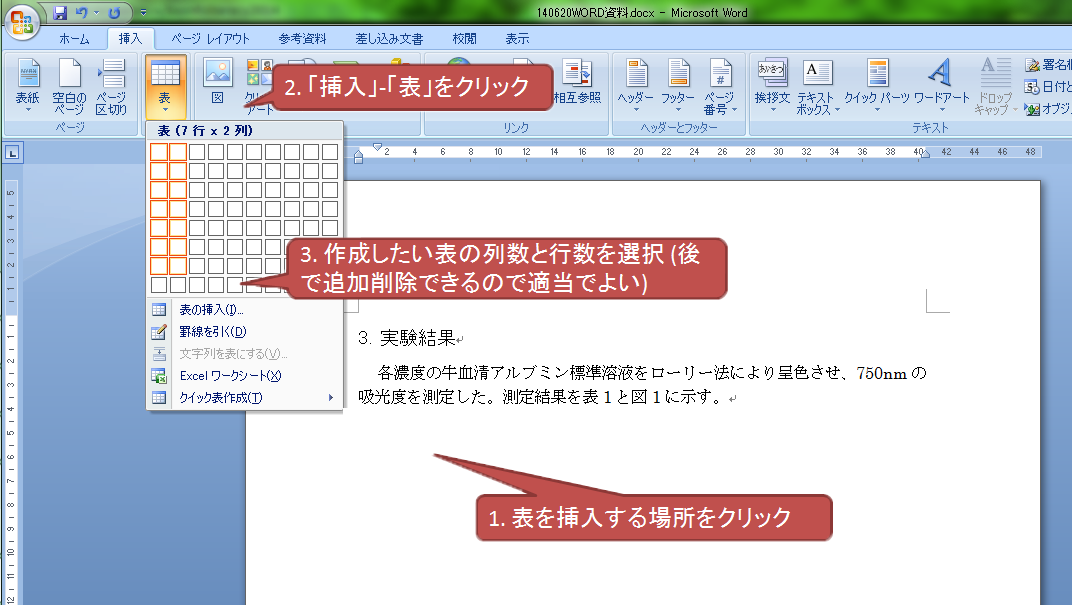 レポートは食品化学基礎実験を除くいずれの実験のものでもよい。 4年生は現在行っている卒業研究のものでもよい。 この課題はWORDの機能を使って見た目のよい文書を作成できるかどうかをみるもののため、レポートの内容(実験の目的をよく理解しているかや適当な考察ができているか)は基本的に課題として評価の対象とはしません。