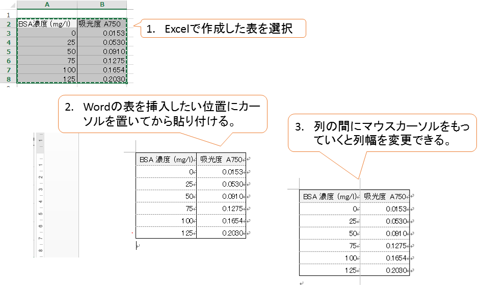 Excelで作成した表を貼り付けます。表のデータをもとにグラフを作成したり、計算を行うときにはこちらのほうが便利です。