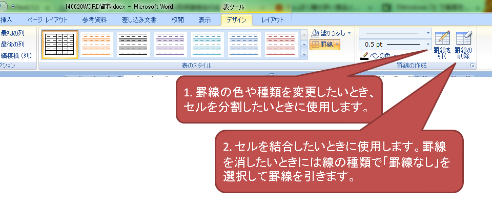 「デザイン」-「罫線の作成」をクリックすると線の色や種類を変更することができます。