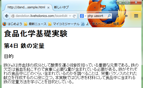 <!DOCTYPE HTML> <html> <body> <h1>食品化学基礎実験</h1> <h2>第4日 鉄の定量</h2> <h3>目的</h3> <p>鉄(Fe)は赤血球の成分として酸素を運ぶ役割を担っている重要な元素である。鉄の欠乏は貧血を起こすので食事に必要な量が含まれている必要がある。鉄がそれぞれの食品中にどのぐらい含まれているのかを調べることは、栄養バランスのとれた献立を作成するのに役に立つ。本実験ではひじきを材料にして食品中に含まれる鉄の定量方法を学ぶことを目的としている。</p> </body> </html>