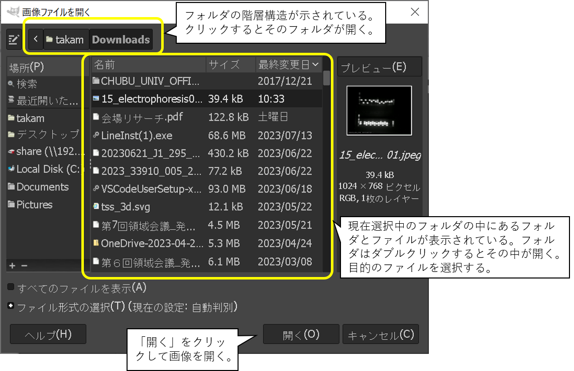 保存した画像をダブルクリックするとGIMPでないソフトが起動するので、必ずGIMPを起動して「ファイル」-「開く」から画像を開いてください。
