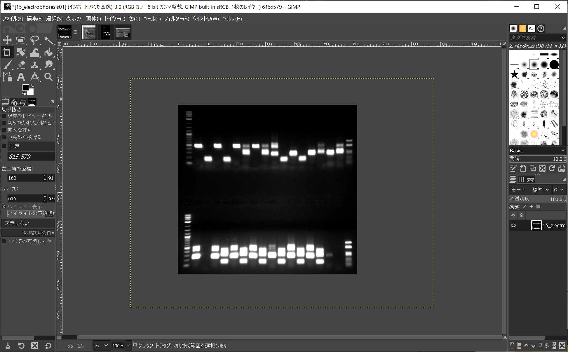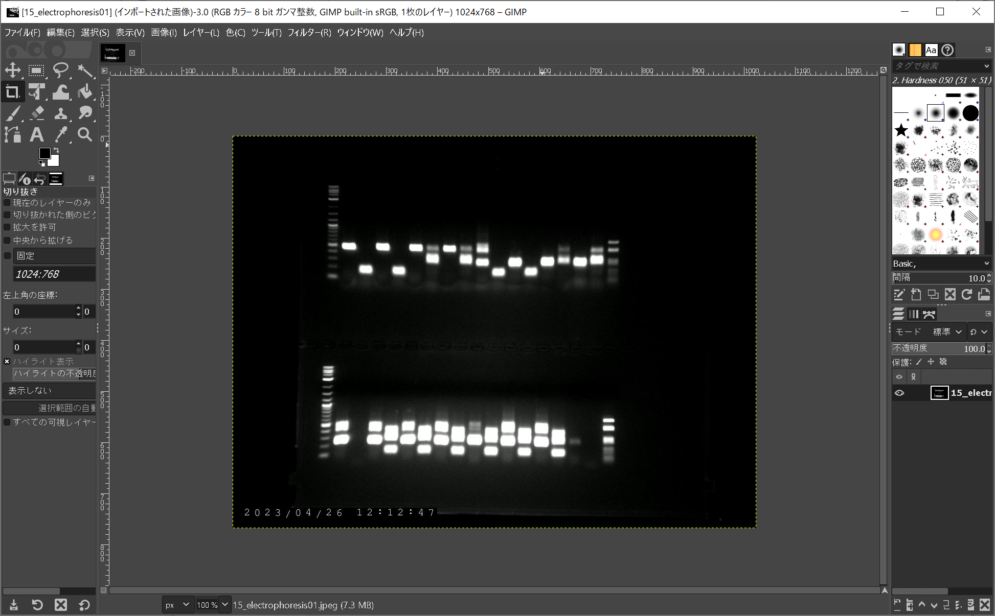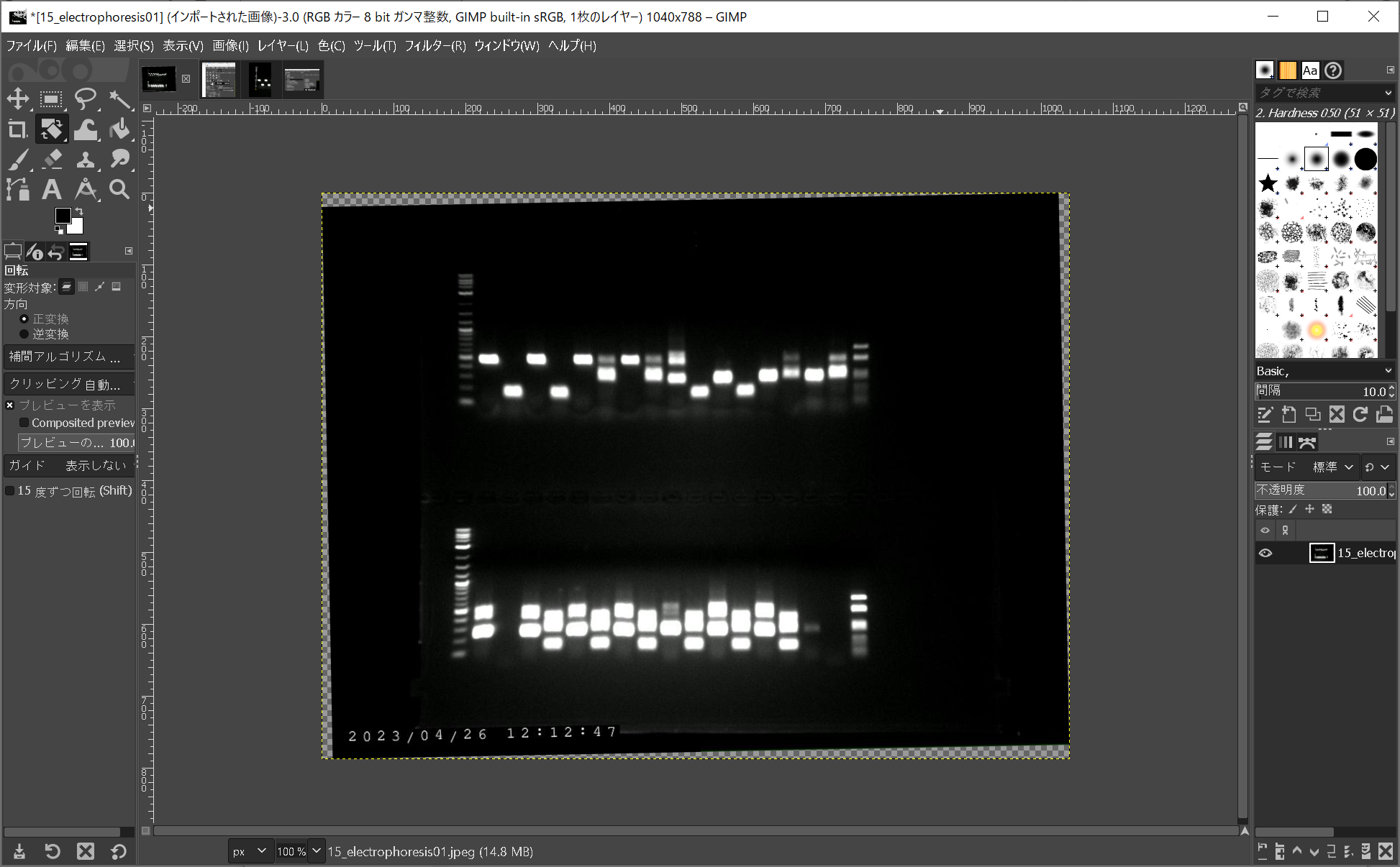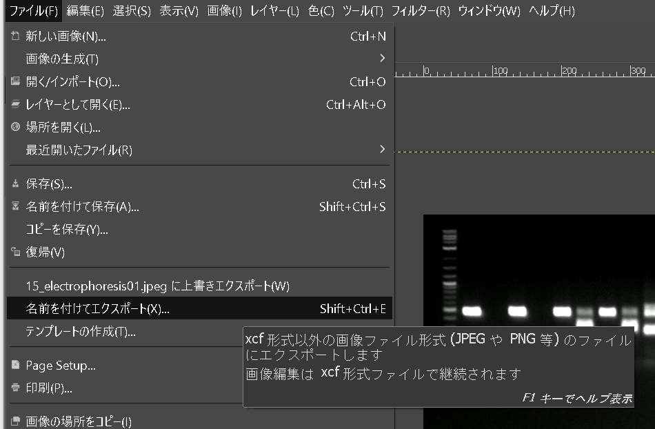 - GIMPを起動し、メニューの「ファイル」-「開く/インポート」を実行し、上記で保存した電気泳動の写真を開く。
