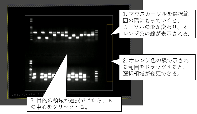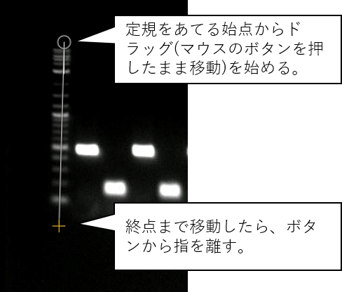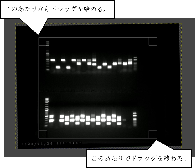 DNAの電気泳動はよく行われる実験である。このデータを発表用に加工する。