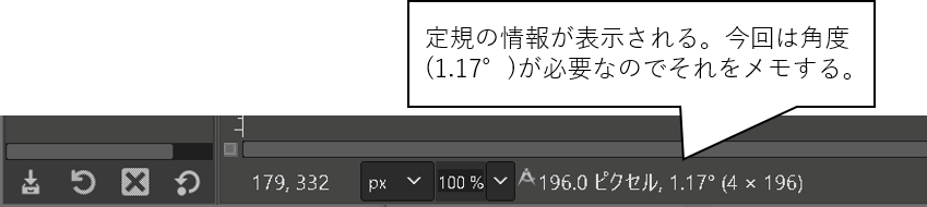 - GIMPのステータスバー(ウィンドウの下端)に測定結果が表示されるので、これをメモしておく。