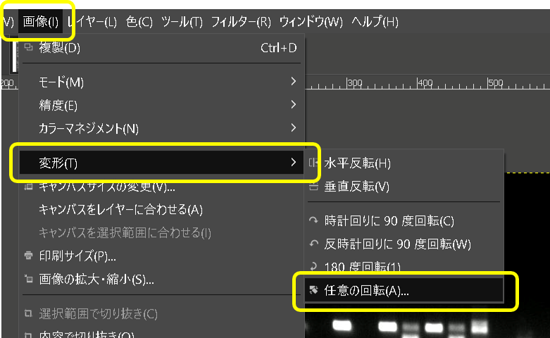 - メニューの「画像」-「変形」-「任意の回転」を実行する。