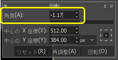 - 角度に定規で測定した傾きを補正するための値を入力し、「回転」をクリックする。