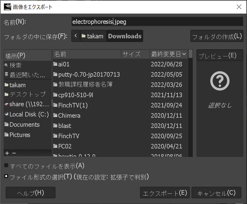 - 適当なファイル名をつけ、エクスポートをクリックする。ファイル名を.jpegや.jpgで終わるとJPEGファイルとして保存される。.pngで終わるとPNGファイルをして保存される。一般にJPEGファイルは写真に向いており、PNGはイラスト(べた塗りの部分がある)に向いているとされる。
