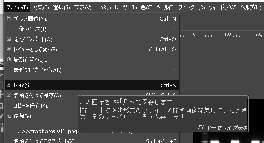 - 「ファイル」-「保存」で、編集データも保存する。作成される.xcfファイルはGIMPでしか開くことができない。
