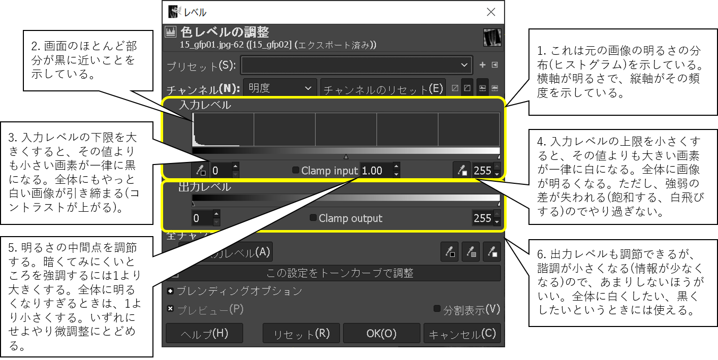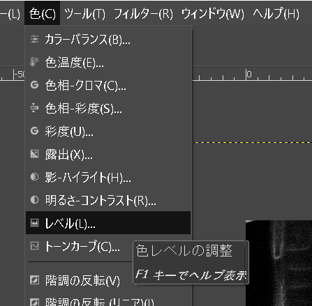 - メニューの「色」-「レベル」を実行する。