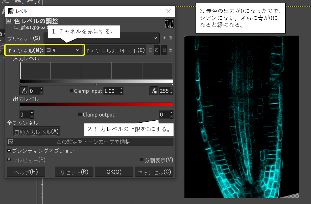 講義資料に沿って、共焦点レーザー顕微鏡で撮影したシロイヌナズナの根の写真をGFPの観察結果らしく加工せよ。