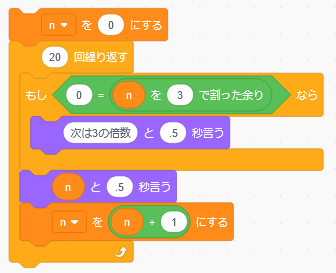 document.write("<h3>1から20までのうち3の倍数を強調表示する</h3>");