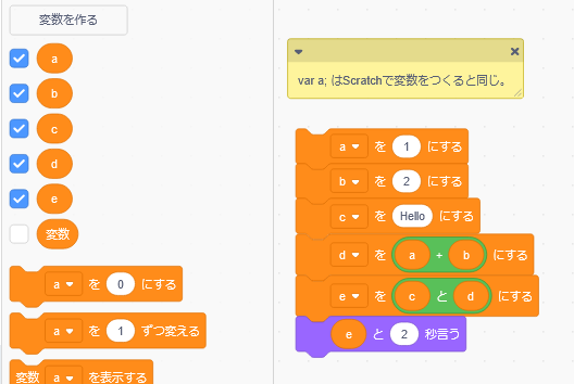 <!DOCTYPE HTML> <html lang='ja_JP'> <body> <pre> <script type='text/javascript'><!-- /* * 変数の使い方 * 変数の名前にはアルファベットと数字と_(アンダーバー)の記号を使うことができる。 * 最初の1文字に数字を使うことはできない。 */ var a; // 変数としてaを使いますよという宣言 a = 1; // aに1を入れます。 b = 2; // Javascriptでは変数は宣言なしに使うこともできます。 var c = "Hello"; // 宣言と同時に変数に値(初期値)を入れる。 var d = a + b; // ここの+は算術演算 var e = c + d; // ここの+は文字列の結合 document.write(e); // 何が表示されるかを予想してから実行してみてください。 // 以下を実行するとどのように表示されるか考えてください。 // document.write(a + b + c); // document.write(c + b + a); // document.write(c + (b + a)); --></script> </pre> </body> </html>