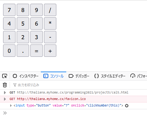 Consoleに <input type='button' value='7' onclick='clickNumber(this)'> のように表示されることがわかる。 これはつまり、clickNumber関数の引数buttonがinputタグそのものになっていることを意味する。